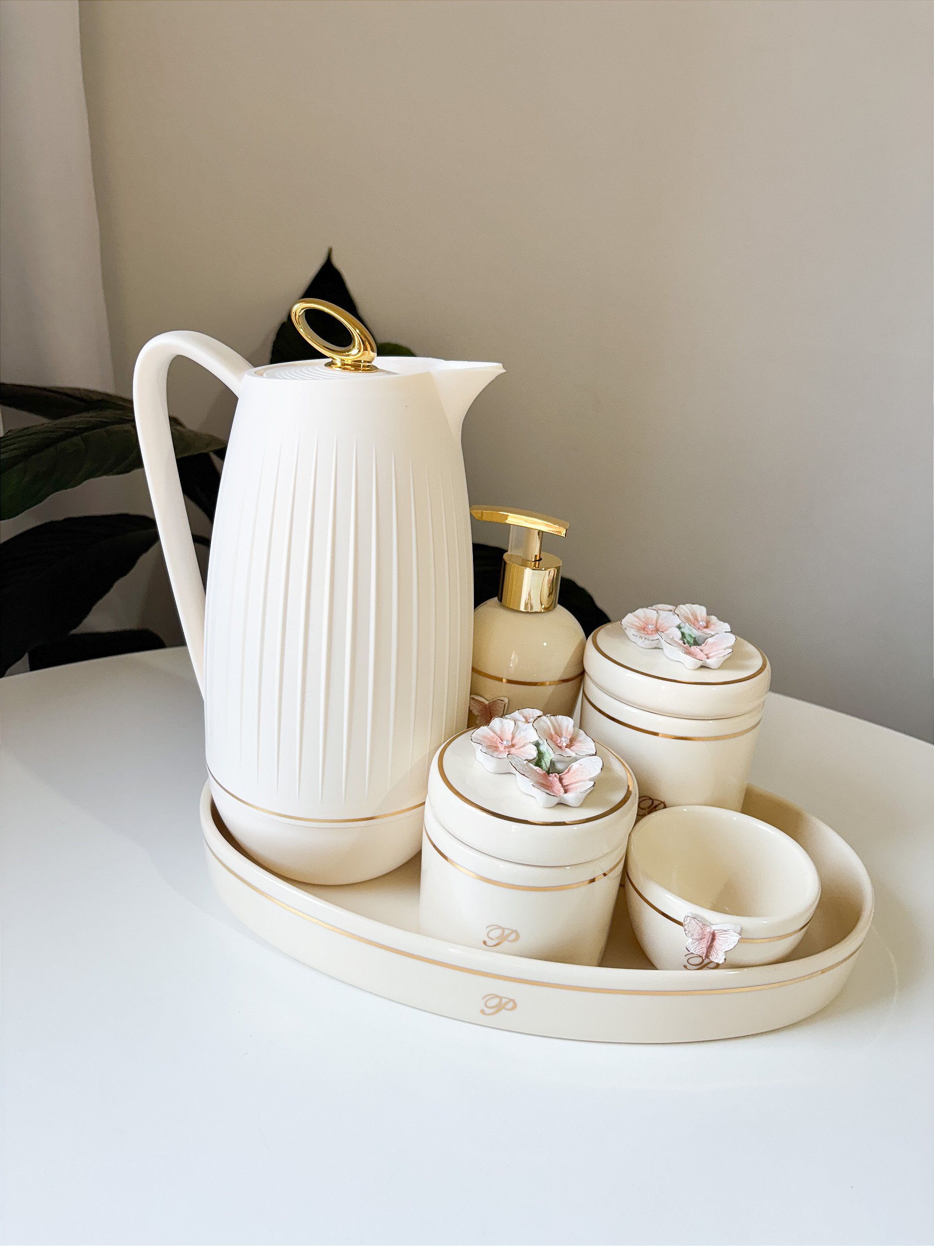 Kit higiene borboletas e flores creme com filete de ouro e inicial 6 peças