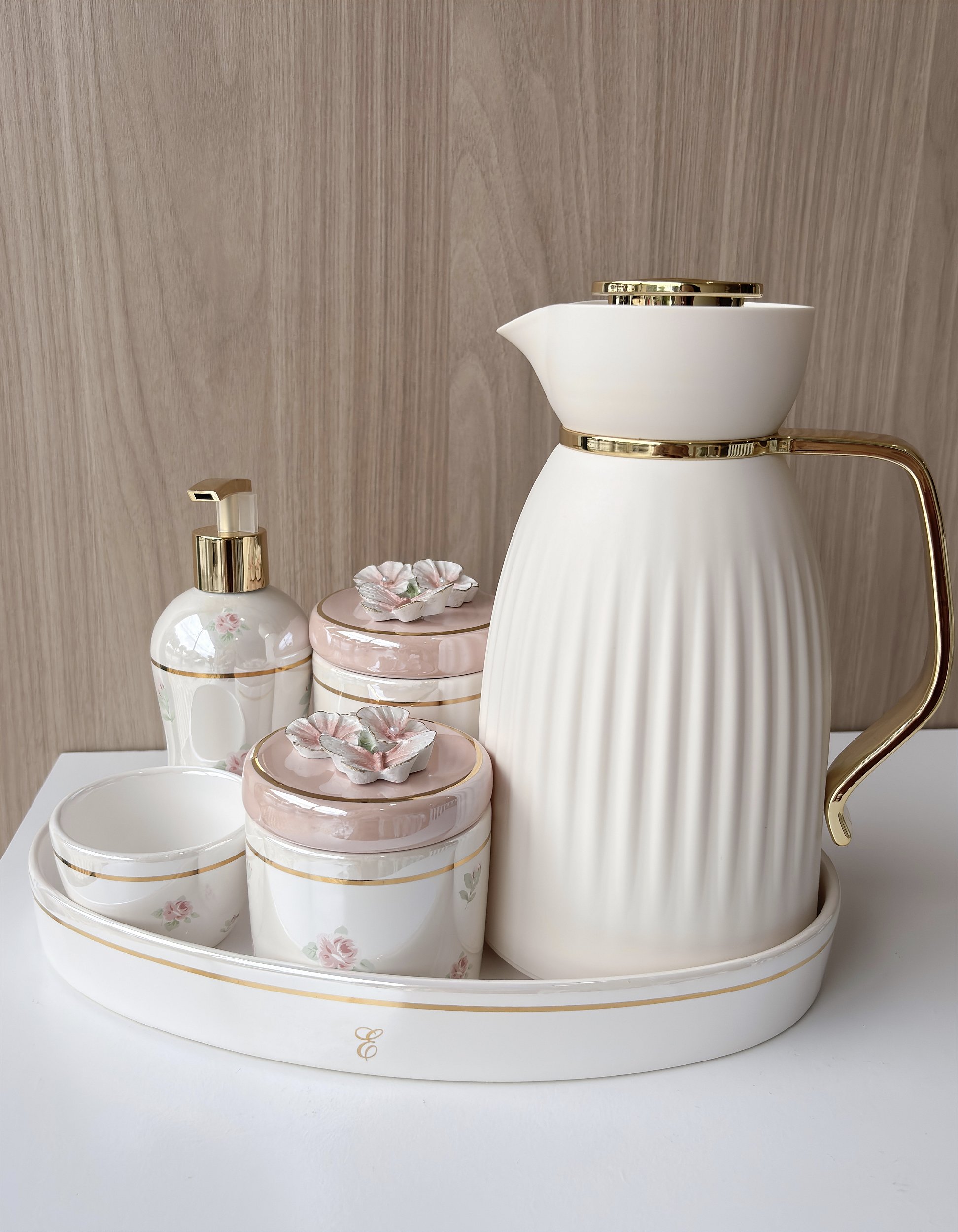 O kit higiene para quarto de bebê com bandeja em cerâmica é uma adição encantadora e funcional para qualquer ambiente infantil. Composto por itens essenciais, como saboneteira, potes para algodão e cotonetes, além de uma bandeja em cerâmica resistente e fácil de limpar, este conjunto combina praticidade e estilo. A bandeja proporciona durabilidade e um toque moderno ao conjunto, enquanto os demais acessórios garantem organização e facilidade no cuidado do bebê. Ideal para pais que buscam praticidade e beleza na decoração do quarto do seu pequeno.