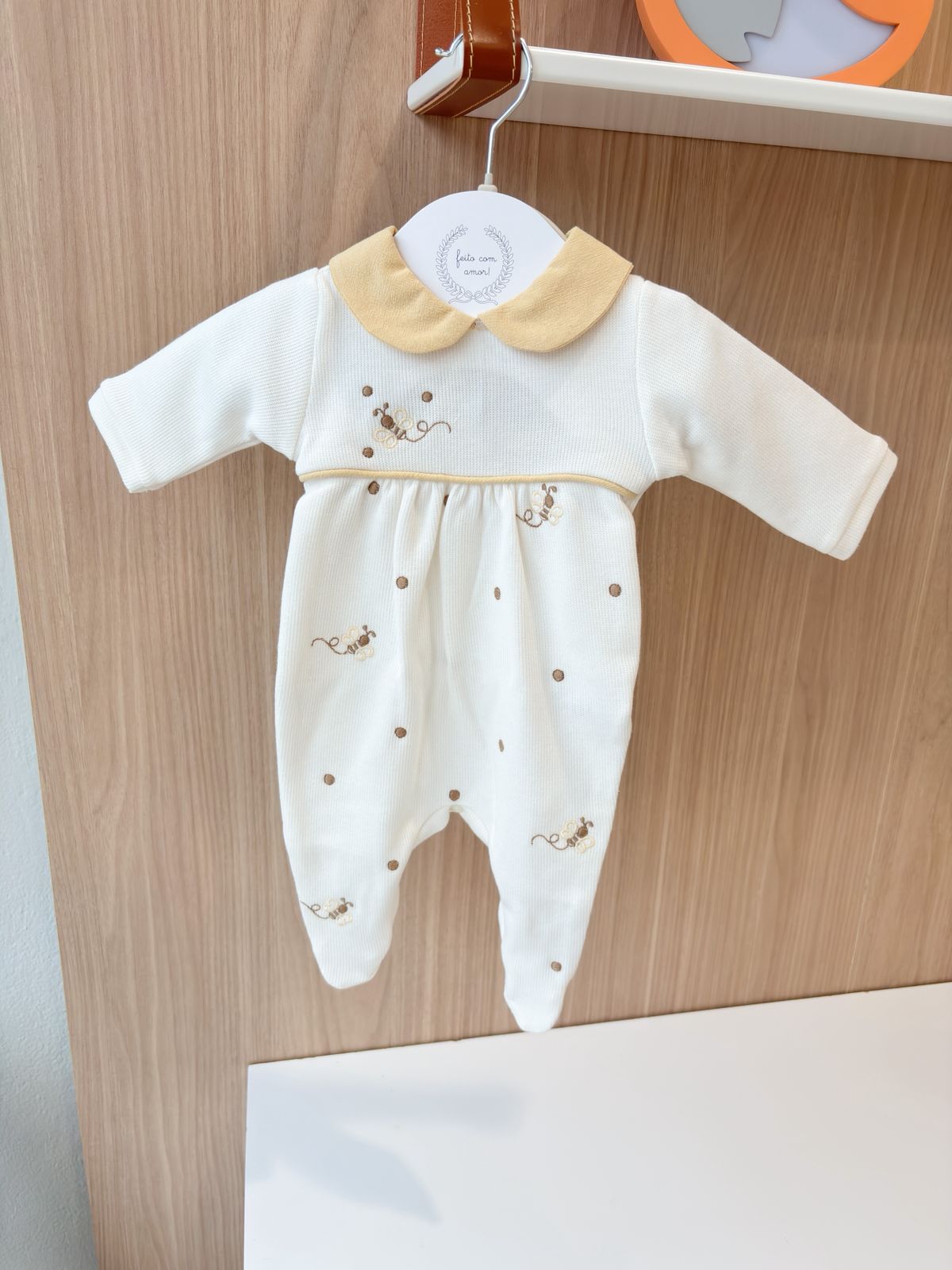 O macacão possui bordados delicados, que trazem charme e sofisticação à peça, tornando-a uma escolha especial para a chegada do bebê e para as primeiras fotos. O acabamento cuidadoso garante conforto sem abrir mão da elegância.