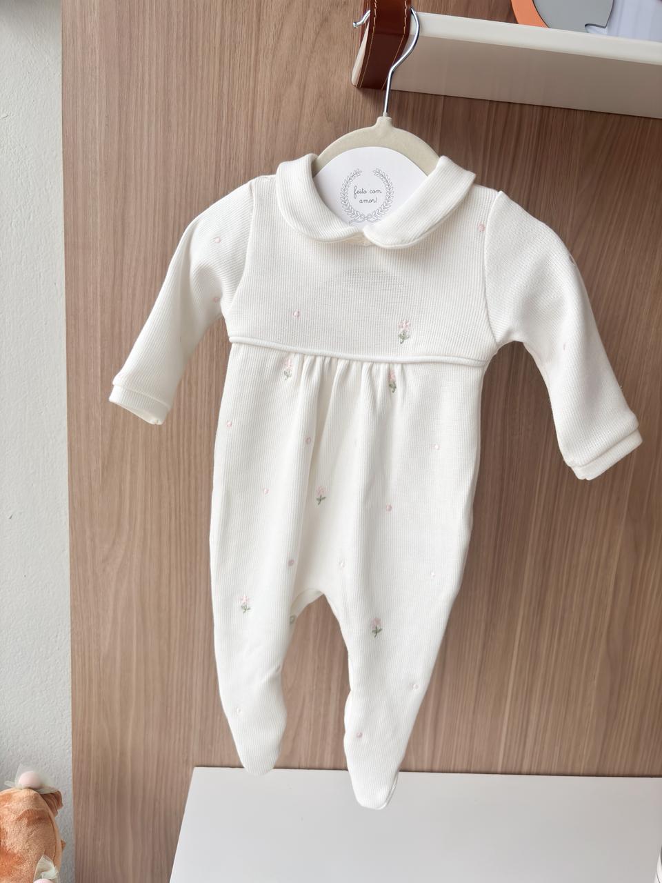 O macacão possui bordados delicados, que trazem charme e sofisticação à peça, tornando-a uma escolha especial para a chegada do bebê e para as primeiras fotos. O acabamento cuidadoso garante conforto sem abrir mão da elegância.