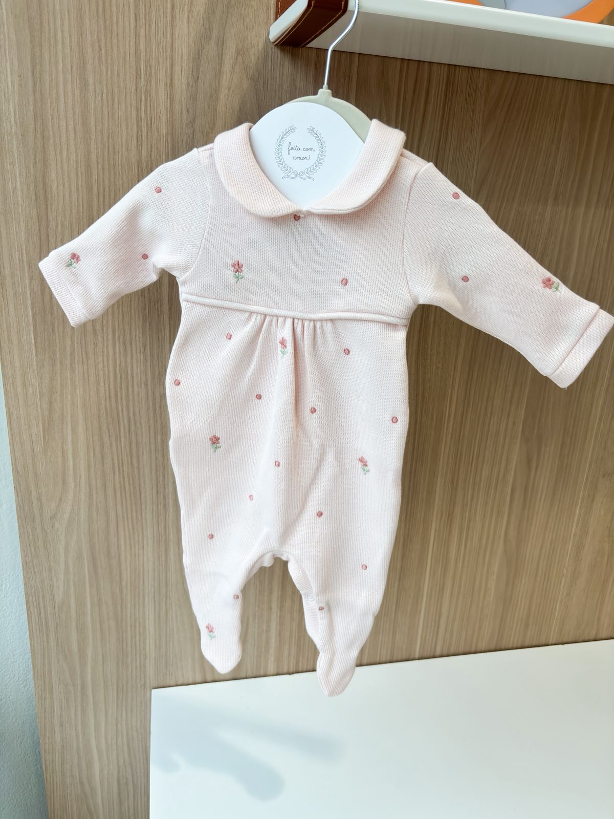 O macacão possui bordados delicados, que trazem charme e sofisticação à peça, tornando-a uma escolha especial para a chegada do bebê e para as primeiras fotos. O acabamento cuidadoso garante conforto sem abrir mão da elegância.